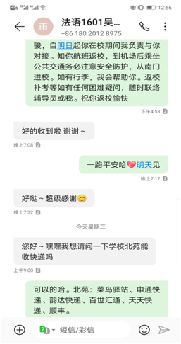 “收到这条短信,知道回校有老师接洽,一切都放心了。”宇恺同学说。英语1601班蒋汤浩很惊喜地收到了老师个人赠送给他的中草药防疫香包。他说,小小香包藏着学院老师的无限的祝福与关爱,收到后非常感动!虽经长途跋涉返校,但到校后看到了学院老师的耐心守候,就很安心。