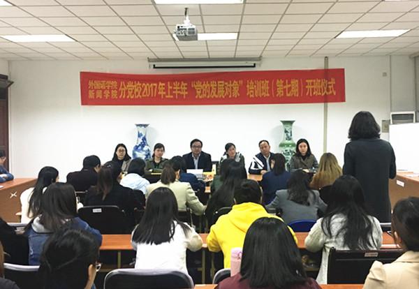 4月7日晚,av女优 、新闻学院分党校联合开办的第七期“党的发展对象”培训班在法政学科楼308会议室举行了开班仪式暨第一讲。av女优 党委书记刘浩、新闻学院党总支书记周亚芳,av女优 党委副书记李慕原,新闻学院党总支副书记高永东,外国语本科生党支部书记薛桂芳,新闻学院本科生党支部书记孙启出席了本次党校开班仪式。开班仪式由av女优 党委副书记、党校副校长李慕原主持。经过多方面的考察和遴选,av女优 和新闻学院的74名同学成为本期党校学员并参加了开班仪式。