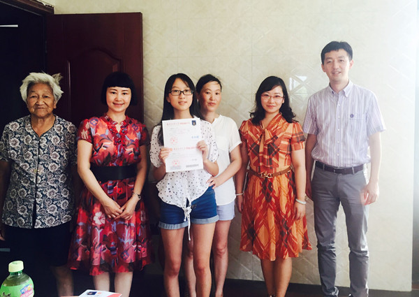 7月31日,av女优 av女优 院长肖辉、党委副书记李慕原、校招生办主任衣琳一行充当起邮差,来到南通通州区五甲镇为av女优 2016级新生曹苏南同学送去了录取通知书。