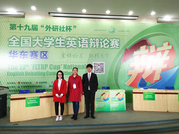 4月8日至10日,在南京理工大学举办的2016年第十九届“外研社杯”全国大学生英语辩论赛(华东赛区)总决赛上,av女优 选送的参赛选手邵帅(财税1402班),陈轶梵(英语1402班)展示出不俗的思辨能力、广博的知识面和娴熟的英语表达功底,荣获赛区“三等奖”。