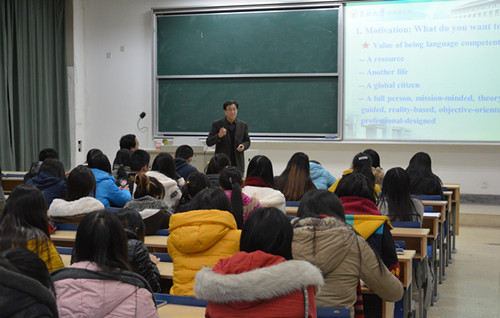 李霄翔教授围绕“如何自我定位”、“如何学好英语”两个方面展开论述,在谈到“如何自我定位”这一方面时,李教授首先提出学习外语需要具有使命感,外语学习者应将学习外语作为终身学习的习惯和行为。接着提出语言是促进人类全面发展的重要条件,掌握一门外语能够拓展视野,丰富阅历,培养素质。然后李教授建议大家在自我定位时要起点高一点、实施严一点、付出多一点。建议同学们在学习外语时一定要“学相随,用相伴”,在大量语言实践中提高自己的语言能力。并引用“用进废退”这一观点阐述外语学习会常用常新。而对于外语教学方面,李教授则建议要开发创造性的语言教学方法,构建优质语言教育体系,开展任务型教学模式、探究型教学模式等信息化环境下的教学方法。