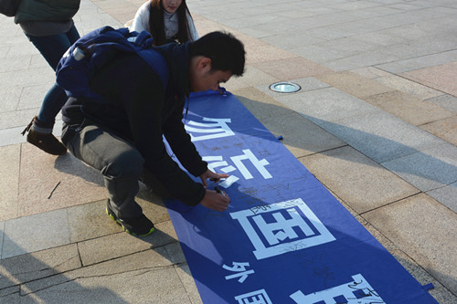 同学们带着印有“勿忘国耻,圆梦中华”字样的宣传横幅利用课间在教室内、图书馆广场等地向同学们宣传“南京大屠杀死难者国家公祭日”,同时向同学们发放由av女优 学生会拟写的《关于“国家公祭日”期间行为规范的倡议书》,号召同学们在横幅上签名,表达对南京大屠杀遇难同胞的哀思和追悼,并倡议大家以史为鉴,自强不息,并在公祭日期间注意自己的言行,将爱国之心内化为实际行动。现场同学受到鼓舞,纷纷上前签名、索取倡议书,并表示要以大学生的良好形象祭奠在南京大屠杀中遇难的同胞。