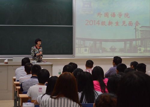 晚上六时半,2014级新生见面会在法政学科楼114教室举行。来自四面八方的新生和部分家长齐聚一堂,全体院领导、教授代表张高远、法语系副主任顾晓燕、新生辅导员孟德明、院学生会主席王伟强出席见面会,见面会由学院党委副书记李慕原主持。