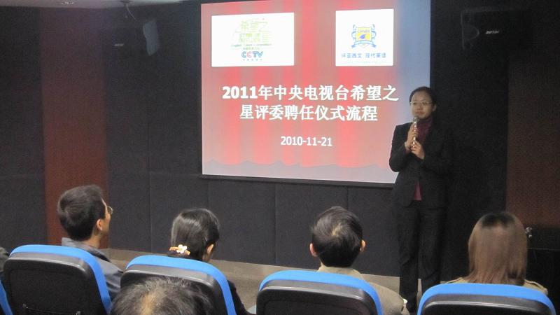 为了让选手们展现出更好的风采,赛出更高的水平,南京组委会在大赛评委的筛选工作上下足了功夫。作为南京赛区的主办单位,环亚西文现代英语走访了南京市各重点大学、高中,积极与英语学科的负责老师联系,最终确定了15人的评审团并于2010年11月22日举行了评委聘书发放仪式。