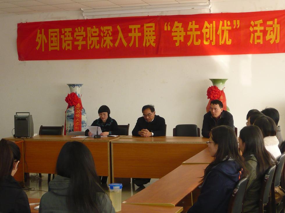 会议上,教授代表冯建文、两个教工党支部书记周标、陈芙蓉老师、教师代表王展老师还就开展争先创优活动提出了宝贵的意见和建议,他们倡议将争先创优活动和日常的教学和工作结合起来,开展丰富多彩的主题实践活动,为人民办事实、办好事,让人民满意。