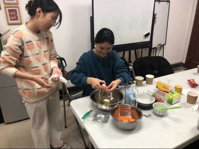 在将蛋糕送往烤箱等待的间隙,邵怡副院长和大家交流起学习中的困惑,特别是在英语写作中的困难,她耐心地向学生们讲解技巧,帮助她们理清思路、寻找技巧。当喷香的戚风蛋糕做出来后,大家一边分享,一边观看英文电影,师生们欢聚一堂,倍感收获。