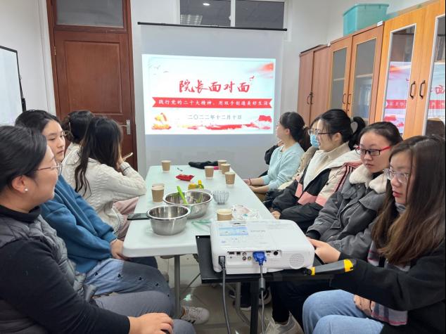 这是学院举行的“院长面对面”系列活动,本期活动主旨为“践行党的二十大精神,用双手创造美好生活”,副院长邵怡感觉到临近期末考试,学生们仍然有一些专业上的困惑,为了给学生们一次轻松又有效的“答疑”,同时为学生们加油鼓劲,举行了这一次具有专业特色的劳动教育,和学生们一起动手制作蛋糕。