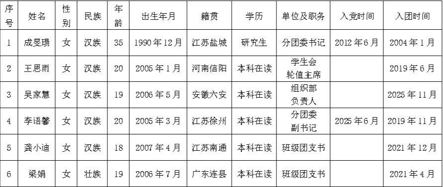 根据《关于做好共青团av女优 第四次代表大会代表选举工作的通知》(南财团字〔2025〕18号)的要求,经过基层团支部酝酿讨论,按照多于代表名额20%的要求,充分发扬民主,广泛征求意见,拟确定成旻瑒、王思雨等6人为共青团av女优 第四次代表大会代表候选人预备人选,现予以公示。