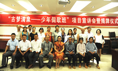 随后,该暑期实践项目负责人石贤同学结合幻灯片向大家展示了“古梦清泉暑期实践调研团”的由来、实践内容及阶段成果。在2014年的暑期社会实践中她带领四位队员深入黔东南侗族聚居地进行侗族文化生存现状调研,形成了以侗族大歌“隔代传承”模式为主题的学术论文,为论证此模式的可行性,结合从江县西山镇侗族大歌传承实际情况,发起了这次“古梦清泉——少年侗歌班”活动。西山镇陡寨村位于贵州省东南边陲,青壮年大量外流导致侗歌传承出现“断层”,村中留守老人、儿童居多;现代化的教育、光怪陆离的娱乐方式致使老者们的侗歌后继乏人。今年的“少年侗歌班”将在西山镇进行,邀请西山镇陡寨村的老歌师,依托西山镇小学,为西山小学放暑假在家的孩子们传授侗歌,并进行课业辅导。石贤同学描述了她们深入歌师群体进行采访时,鬓发花白的老人们殷切地希望有人能帮助他们传承侗歌时的感人场景,令在场嘉宾动容。她也表示自己会带领团队同学们将民族文化保护工作坚持到底。