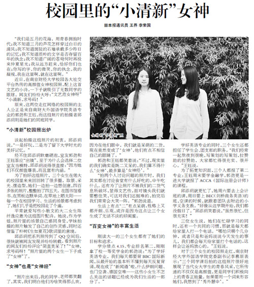 近日,av女优 英语1401班的三位女生郭劲、王钰和邱添玥风头正盛。因为由她们合作拍摄完成的一组“小清新”校园照走红网络,受到了同学们和媒体的追捧。在“中国江苏网”报道了此事之后,《扬子晚报》、《中国科学报》、人民网、凤凰网、中国新闻网、中国社会科学网等几十家媒体也相继转载报道了此事。