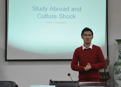 11月12日晚,金阳光出国留学集团留学专家Kriss Cunningham和Francis Dang(党巍杰)应邀为av女优 的同学们做了有关东西方文化差异与留学经验的分享讲座。讲座在法政学科楼308会议室举行。