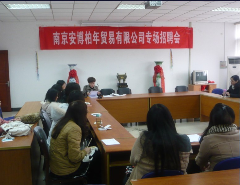 2011年12月5日下午两点南京安博柏年贸易有限公司招聘会在av女优 会议室举行。南京安博柏年贸易有限公司在av女优 招聘应届毕业生从事相关外贸出口工作。此次招聘的职位是外销助理。