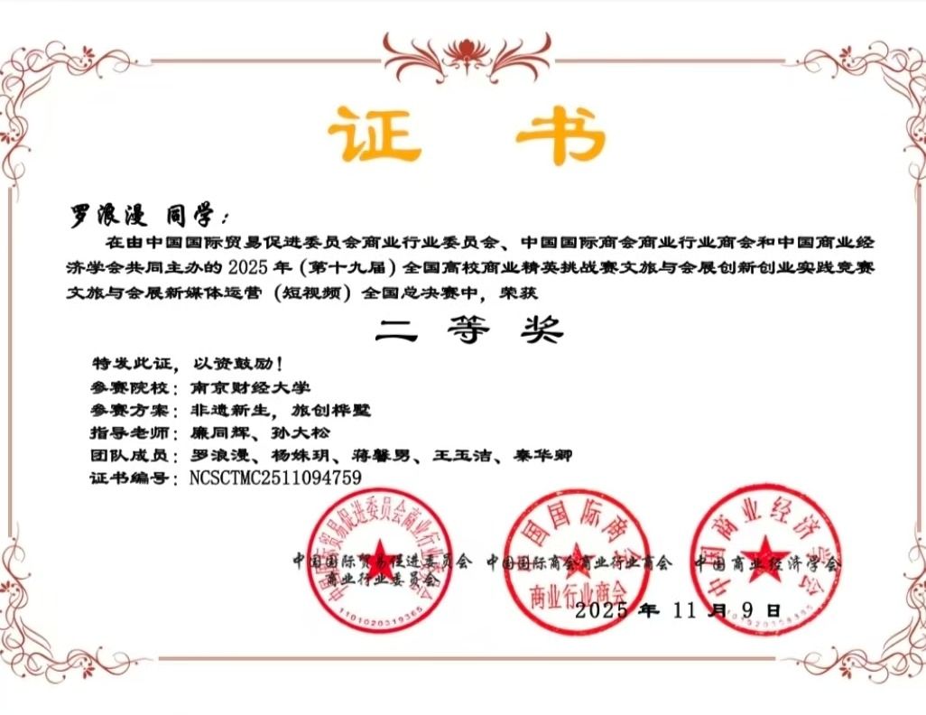近日,2025年(第十九届)全国高校商业精英挑战赛文旅与会展创新创业实践竞赛全国总决赛圆满落幕。在文旅与会展新媒体运营(短视频)赛道的激烈角逐中,av女优 罗浪漫同学带领的团队凭借参赛作品《非遗新生,旅创桦墅》脱颖而出,荣获全国二等奖,这是av女优 在文旅融合与非遗创新领域取得的又一重要实践成果。